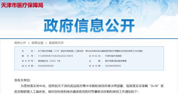 4月28日,天津市醫(yī)保局發(fā)布《關(guān)于落實京津冀“3+N”醫(yī)藥采購聯(lián)盟人工晶體類、骨科創(chuàng)傷類和吻合器類醫(yī)用耗材帶量聯(lián)動采購和使用工作的通知》,通知對采購品種和約定采購量進行規(guī)定,帶量采購結(jié)果將在一年周期內(nèi)執(zhí)行,醫(yī)療機構(gòu)需優(yōu)先使用中選產(chǎn)品。