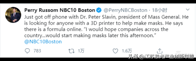 3月20日,美國(guó)媒體NBC10 Boston記者佩里·魯索姆(Perry Russom)通過(guò)社交媒體透露,麻省總醫(yī)院院長(zhǎng)彼得·斯萊文Peter Slavin正在尋找擁有3D打印機(jī)的人,希望其能幫忙生產(chǎn)口罩,并表示“希望全國(guó)的3D打印公司從今天下午就開(kāi)始生產(chǎn)口罩?!?/p>