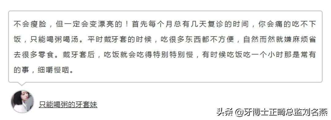 在矯正期間,因?yàn)檠捞自颍芏嗳顺詵|西不方便。吃得少了,脂肪也就變少了。自然就瘦了。但是并不是所有人戴牙套都能瘦下來,畢竟有些人胃口好,做完牙齒矯正之后,體重反而還胖了呢。