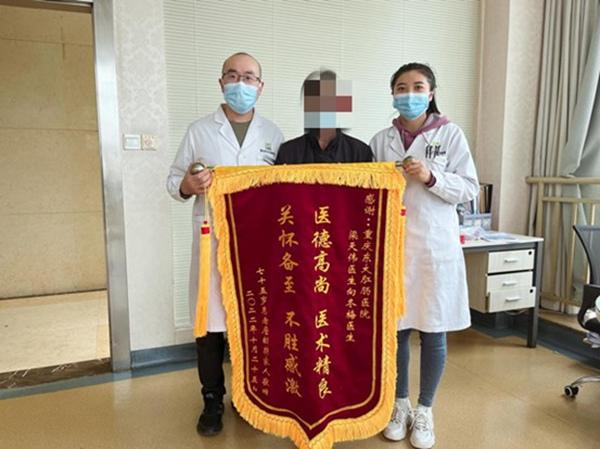 近日,75歲詹婆婆將一面寫有“醫(yī)德高尚醫(yī)術精良,關懷備至不勝感激”的錦旗,送到重慶東大肛腸醫(yī)院醫(yī)生梁天偉和醫(yī)助向冬梅手中,以此表達對全體醫(yī)護人員的衷心感謝。